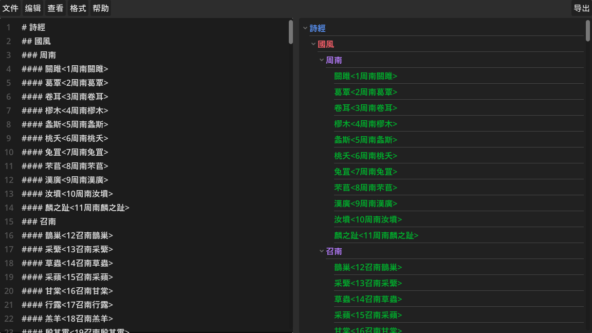 这是一款基于文本编辑和Markdown标题语法的树形数据编辑器。
